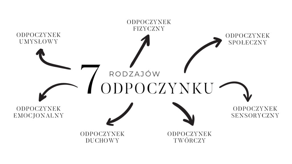 Te siedem rodzajów odpoczynku to: fizyczny, umysłowy, duchowy, emocjonalny, społeczny, zmysłowy i twórczy. Każdy rodzaj wypoczynku ma swoje własne cechy, które dadzą o sobie znać w przypadku deficytu.