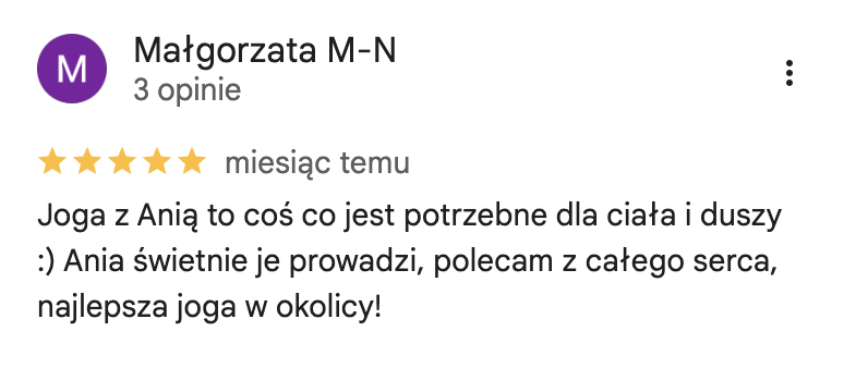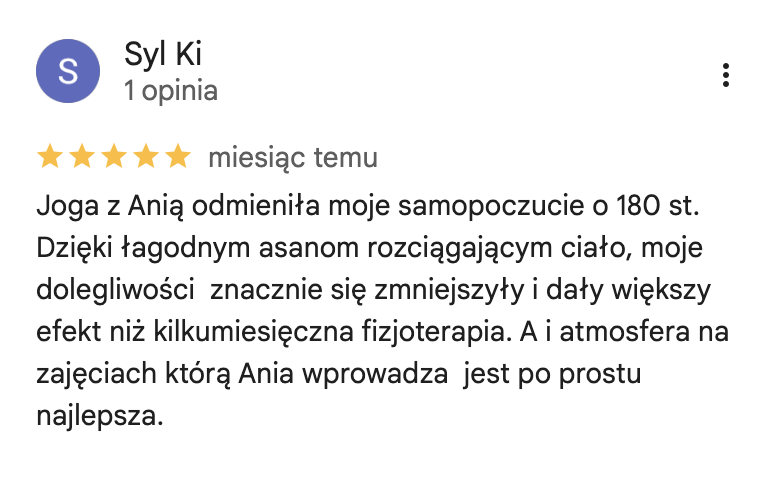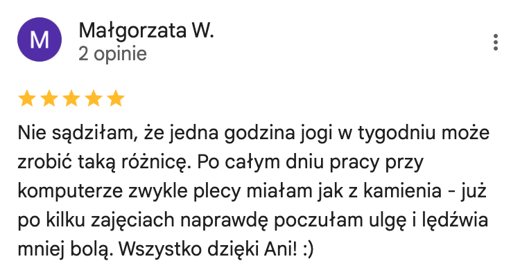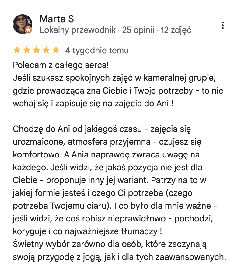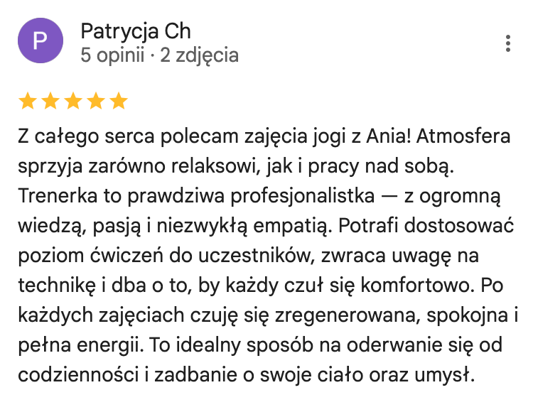Ukończyłam kursy nauczycielskie w 3 stylach jogi (Vinyasa, Yin oraz Nidra) akredytowane przez międzynarodową organizację Yoga Alliance. Na co dzień pracuję z kobietami, którym pomagam uwolnić się od stresu i odzyskać życiową energię. Swoje doświadczenie w pracy z ludźmi zdobywałam w warszawskich szkołach jogi, ale także przy większych projektach takich jak adidas Runners Warsaw czy Open’er Festival.