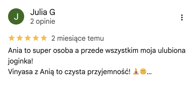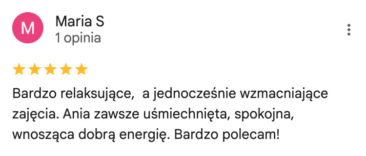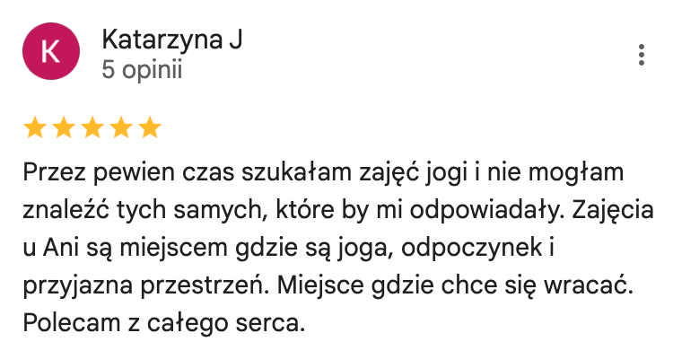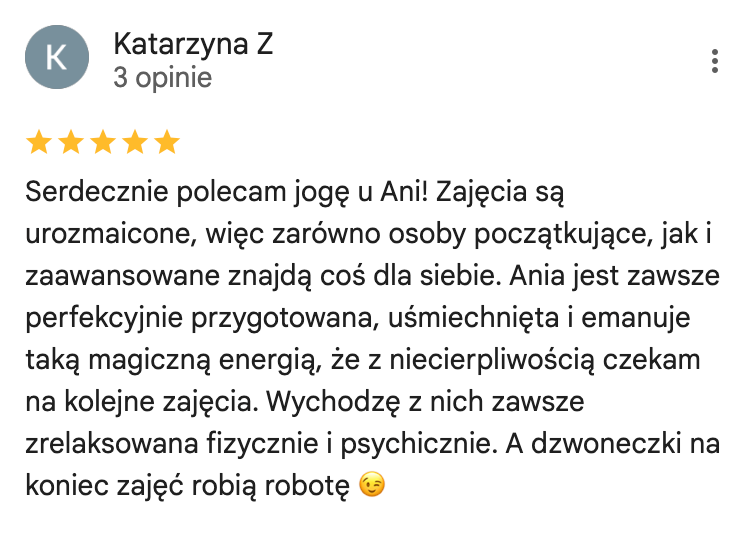 Ukończyłam kursy nauczycielskie w 3 stylach jogi (Vinyasa, Yin oraz Nidra) akredytowane przez międzynarodową organizację Yoga Alliance. Na co dzień pracuję z kobietami, którym pomagam uwolnić się od stresu i odzyskać życiową energię. Swoje doświadczenie w pracy z ludźmi zdobywałam w warszawskich szkołach jogi, ale także przy większych projektach takich jak adidas Runners Warsaw czy Open’er Festival.